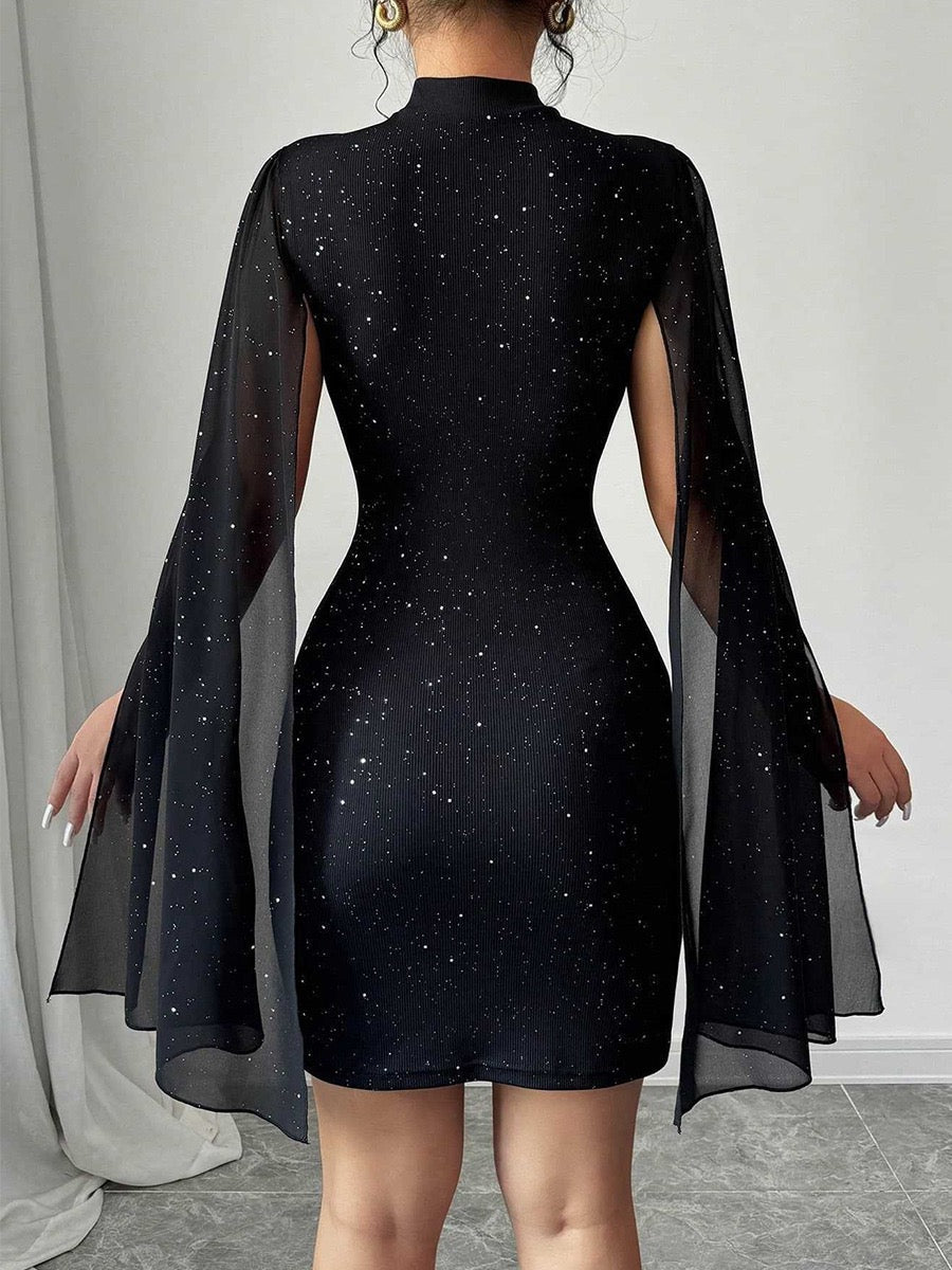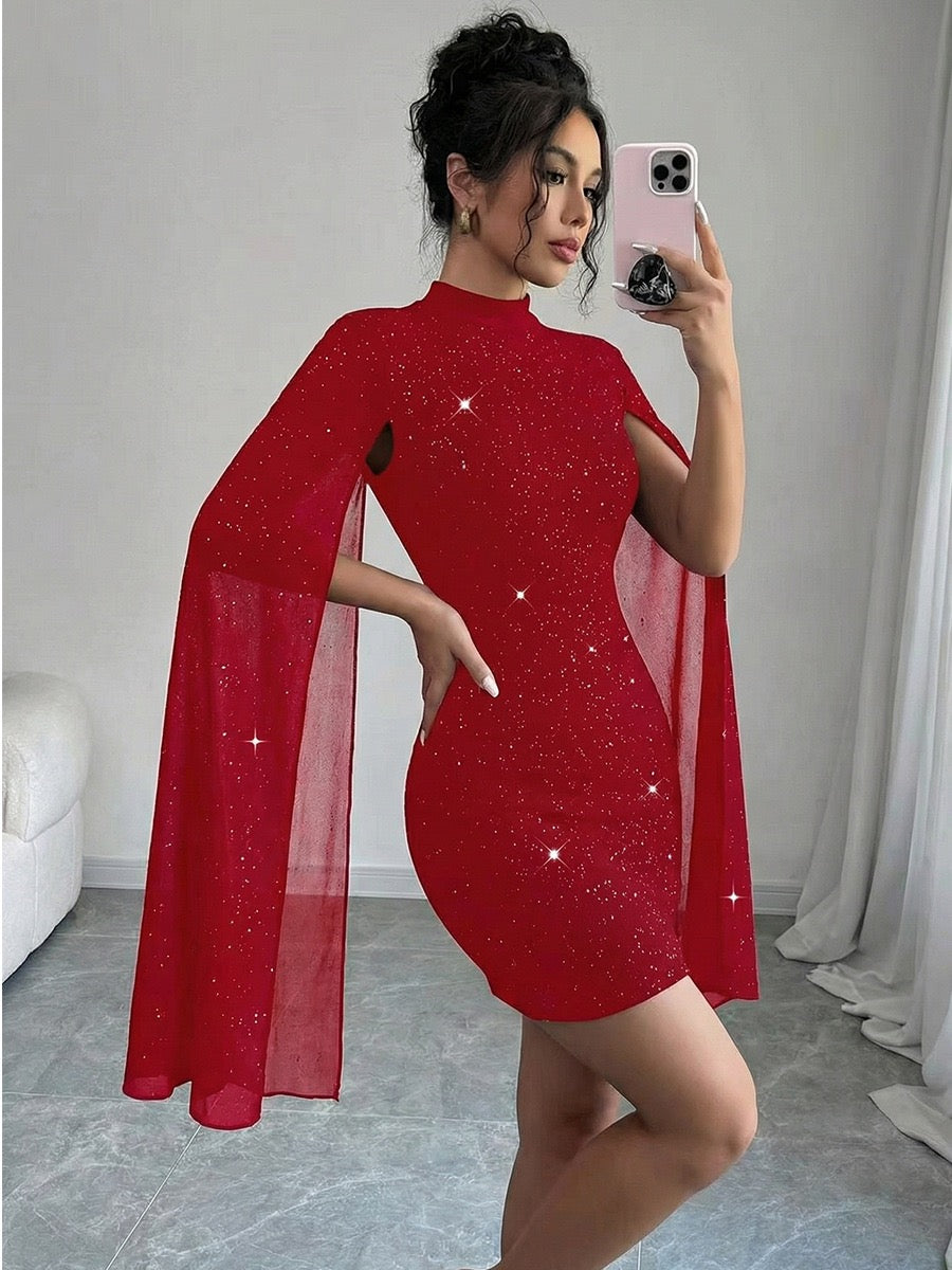 • Design: High neckline, fitted mini silhouette, sheer cape sleeves, clean sculpting lines.