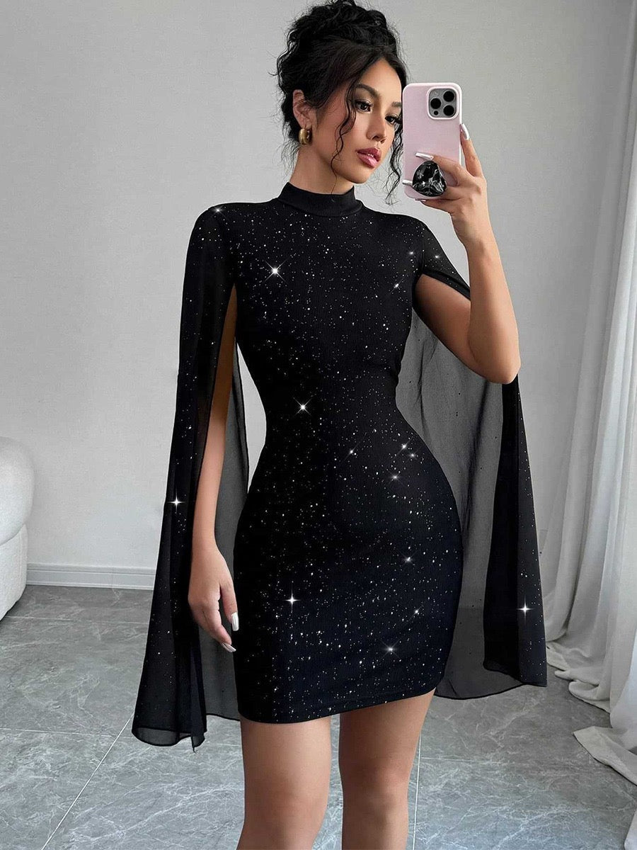 Elegant High Neck Cape Sleeve Mini Dress